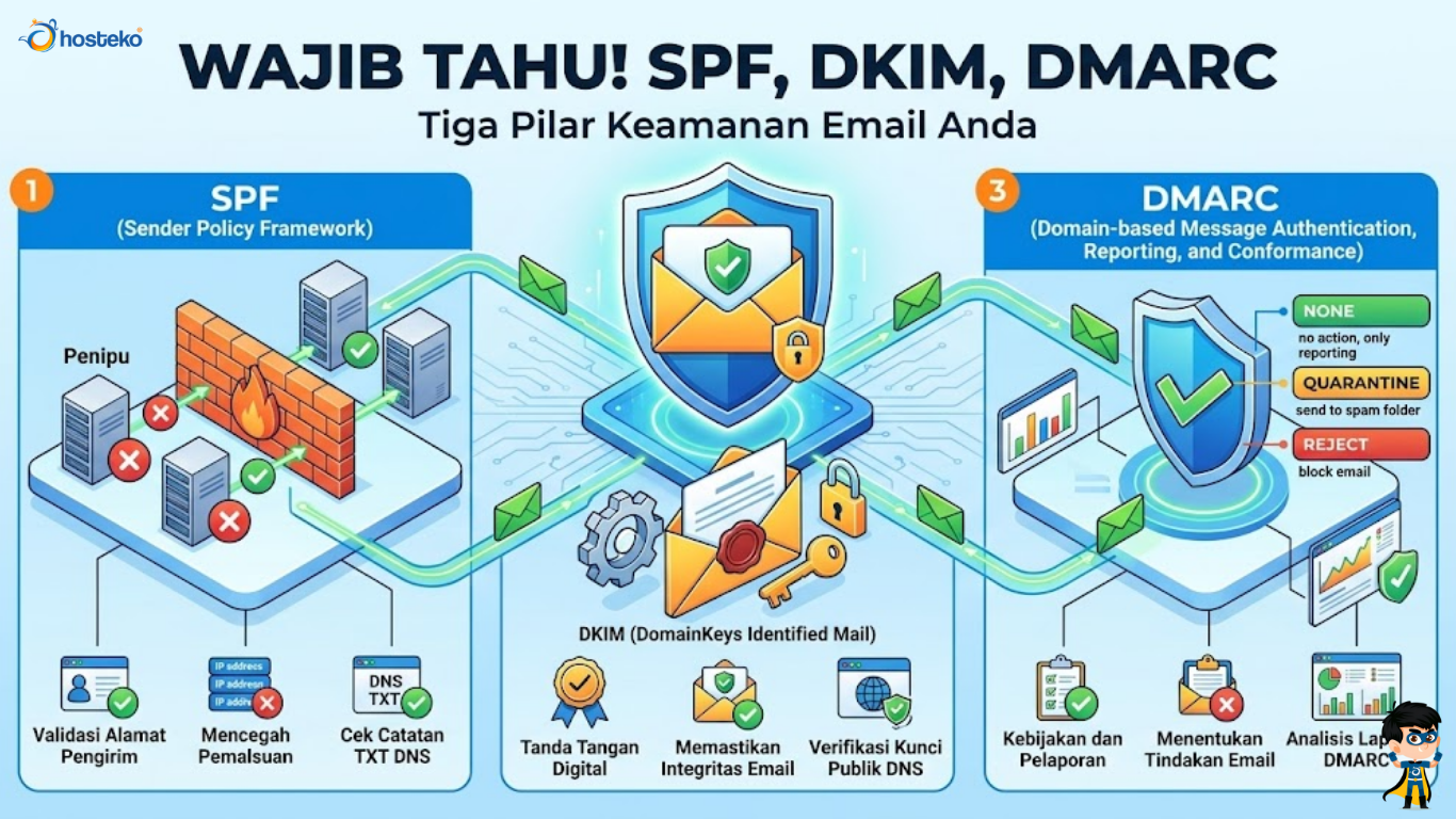 SPF, DKIM, dan DMARC adalah tiga komponen penting dalam sistem keamanan email modern. SPF memastikan pengirim sah, DKIM menjaga integritas pesan, dan DMARC mengatur kebijakan serta memberikan laporan.