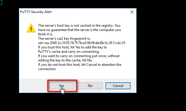 - Silahkan klik Yes pada jendela PuTTY Security alert